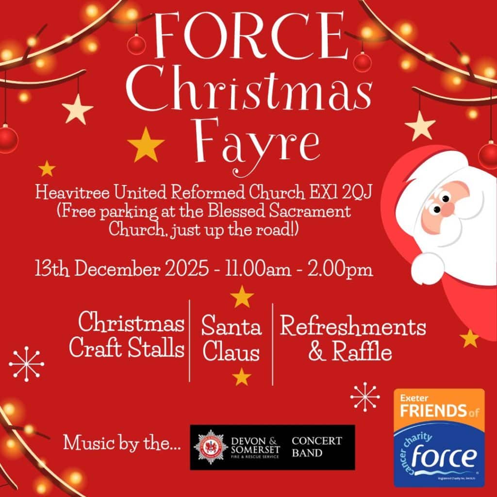 Exeter Friends of FORCE are holding a Christmas Fayre at the Heavitree United Reformed Church, with FREE parking at the Blessed Sacrament Church (just up the road) at 29 Fore St, Heavitree, Exeter EX1 2QJ.