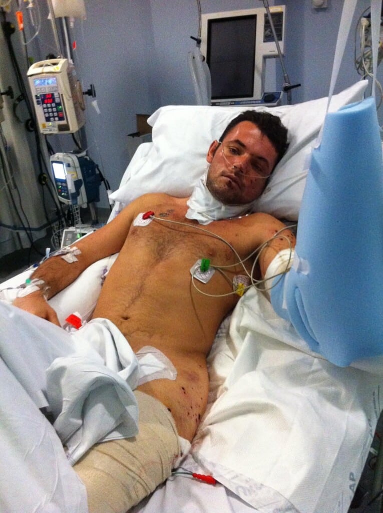 The left side of his body was, in his words, smashed to pieces, and after a number of operations, he decided to have his left leg amputated three years later.