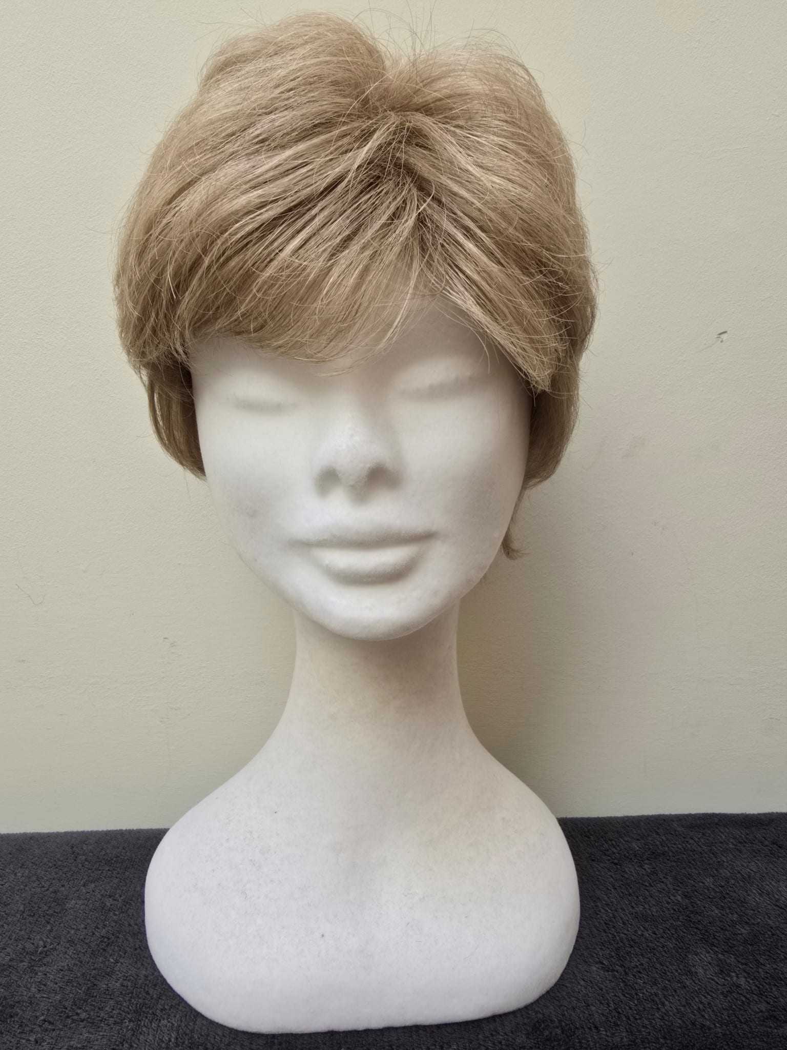 A short blonde wig with a basic wig cap.